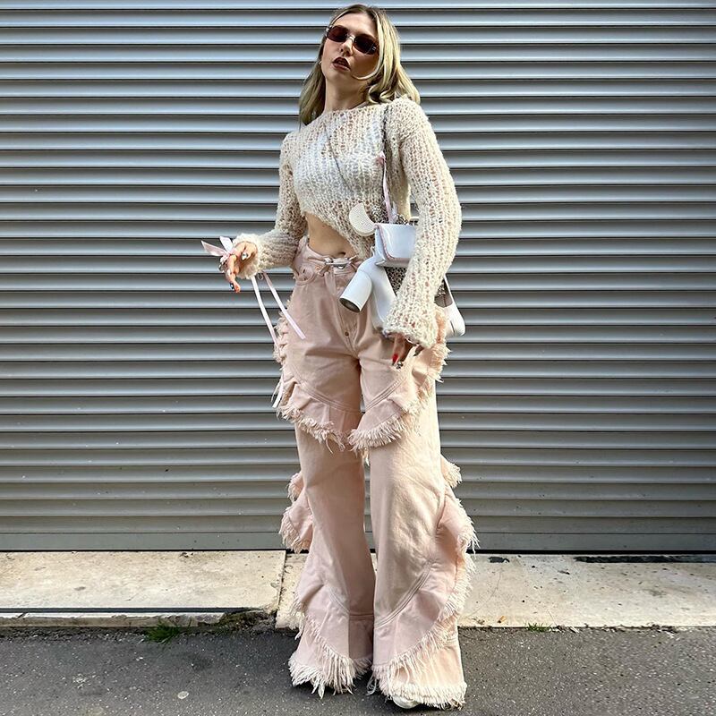 ボーイッシュなのに女性らしいシルエットが、おしゃれさを引き立てます。程よく広がる若干フレアな裾のフリンジが、足元にエレガントな動きを与えます。